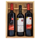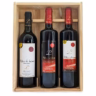 Caja de madera, con tapa corredera y asa, estampada con el logotipo, para 3 botellas de vino.