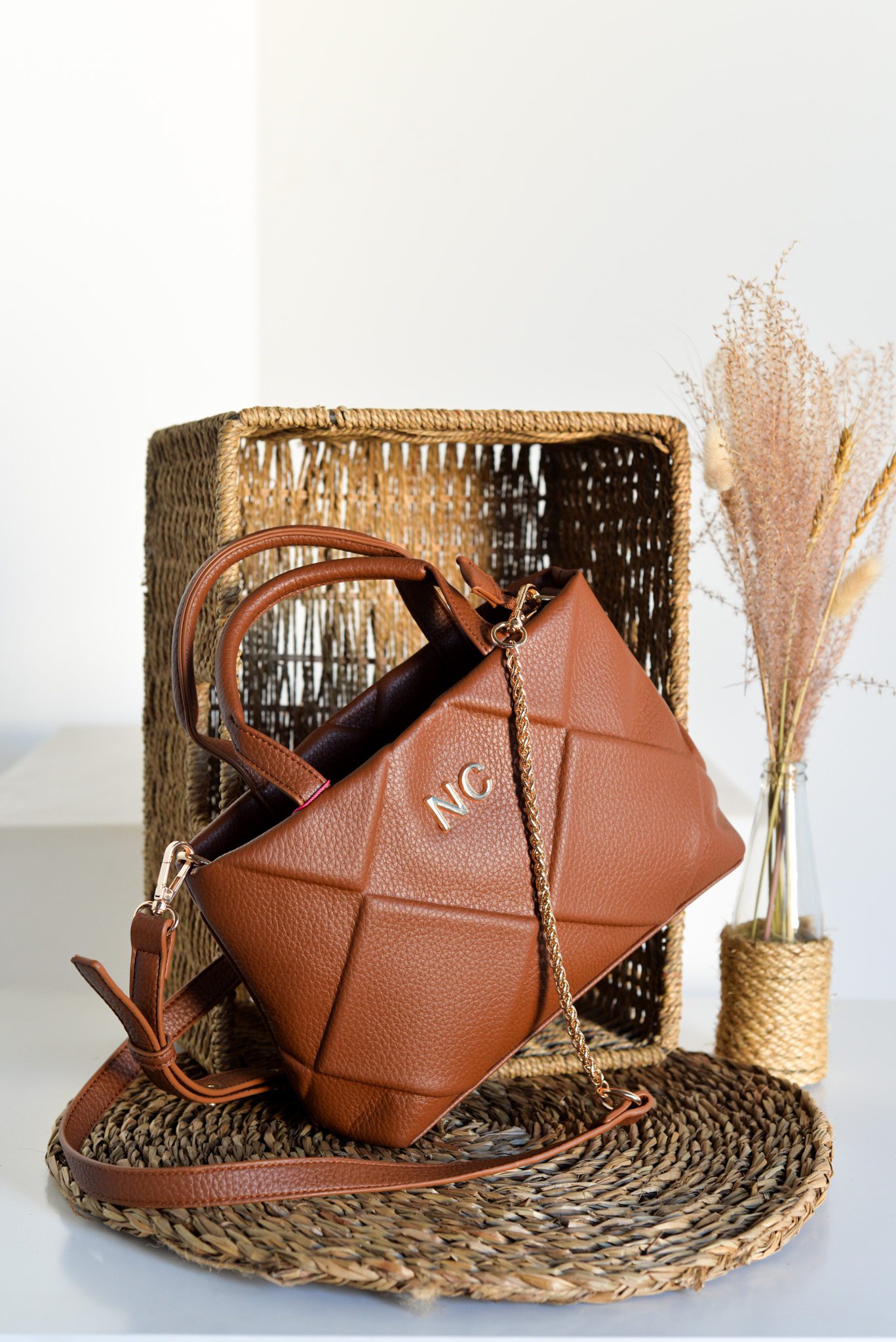 Este bolso versátil se puede usar de mano, de manera coqueta y elegante, o como bandolera, gracias a su correa. Las iniciales NC en metal, como sello de distinción de la marca, agregan un toque de glamour discreto. El diseño de formato tote le da un aire de frescura y atemporalidad,