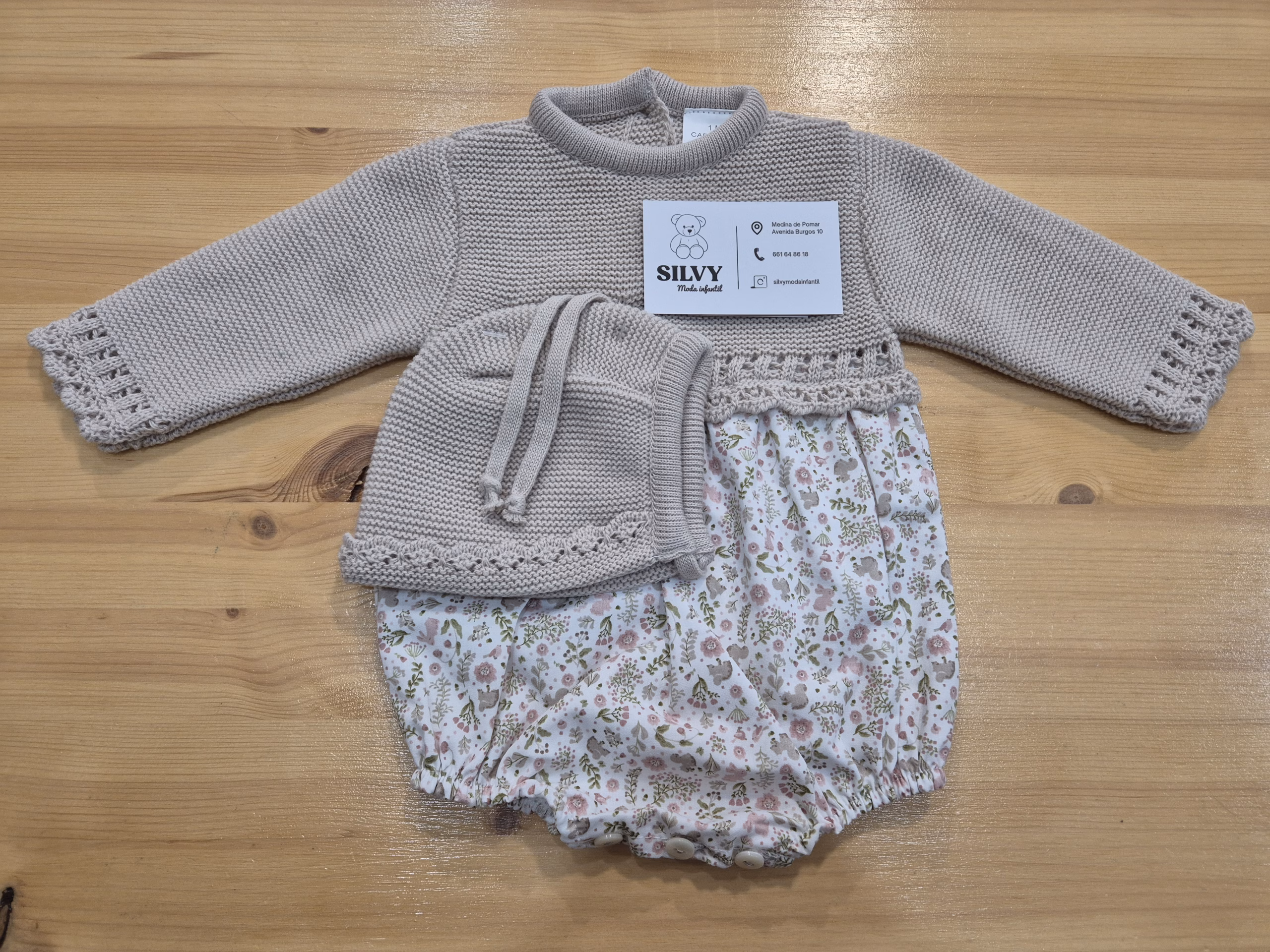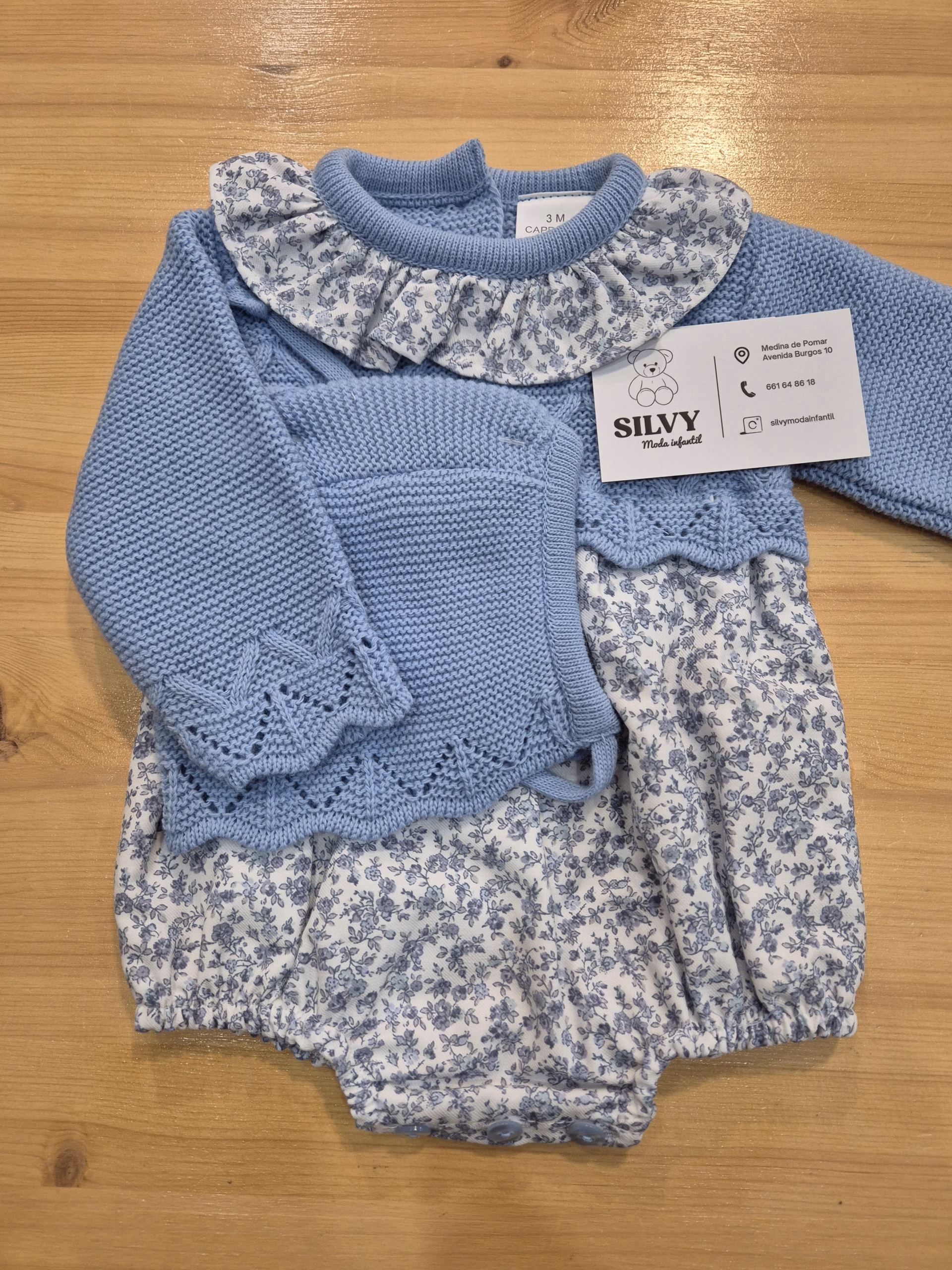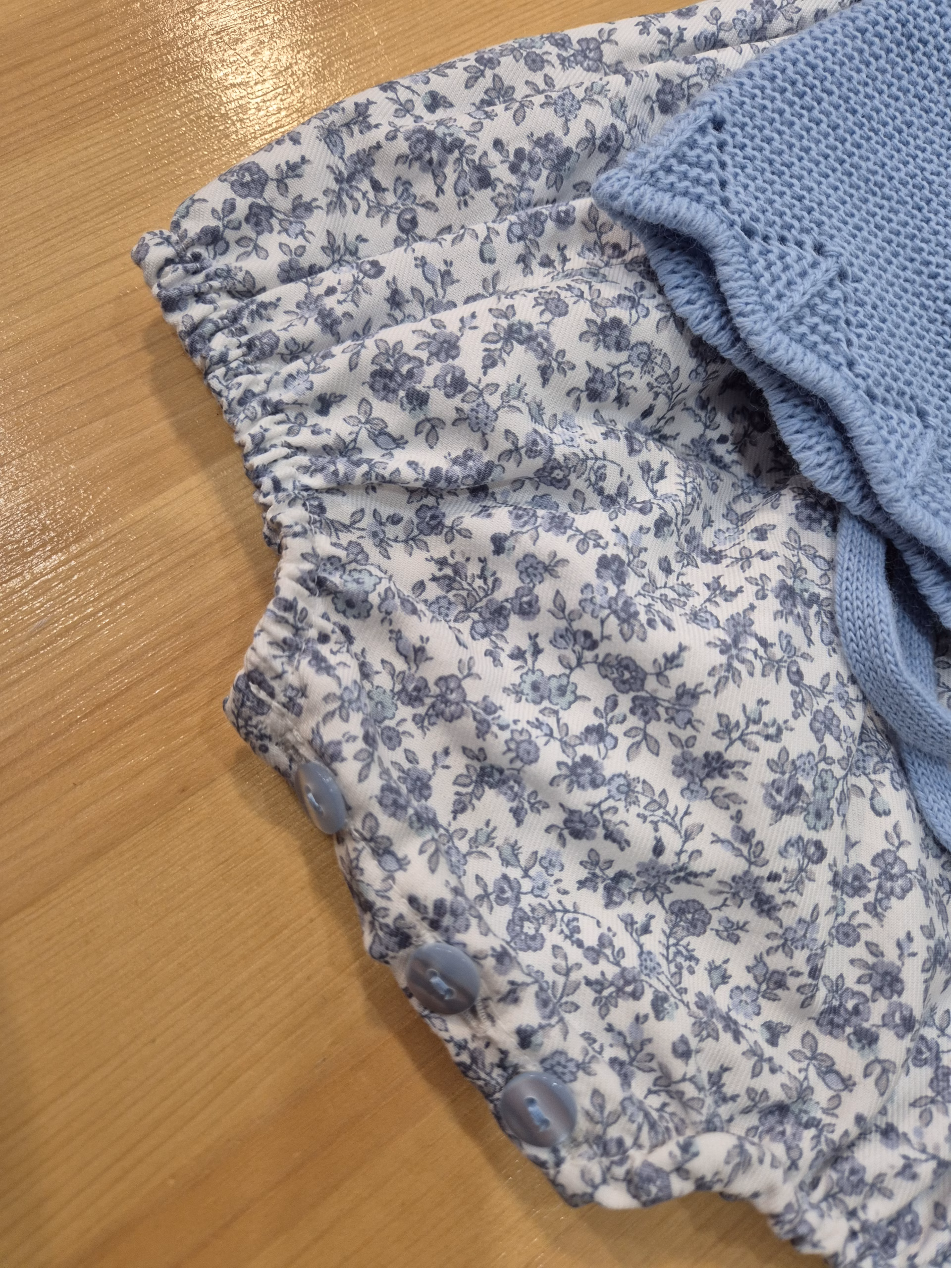 Pelele y capota en dralon + tejido en flores azules. Forro interior y tres botones en la zona del pañal. Gran calidad.