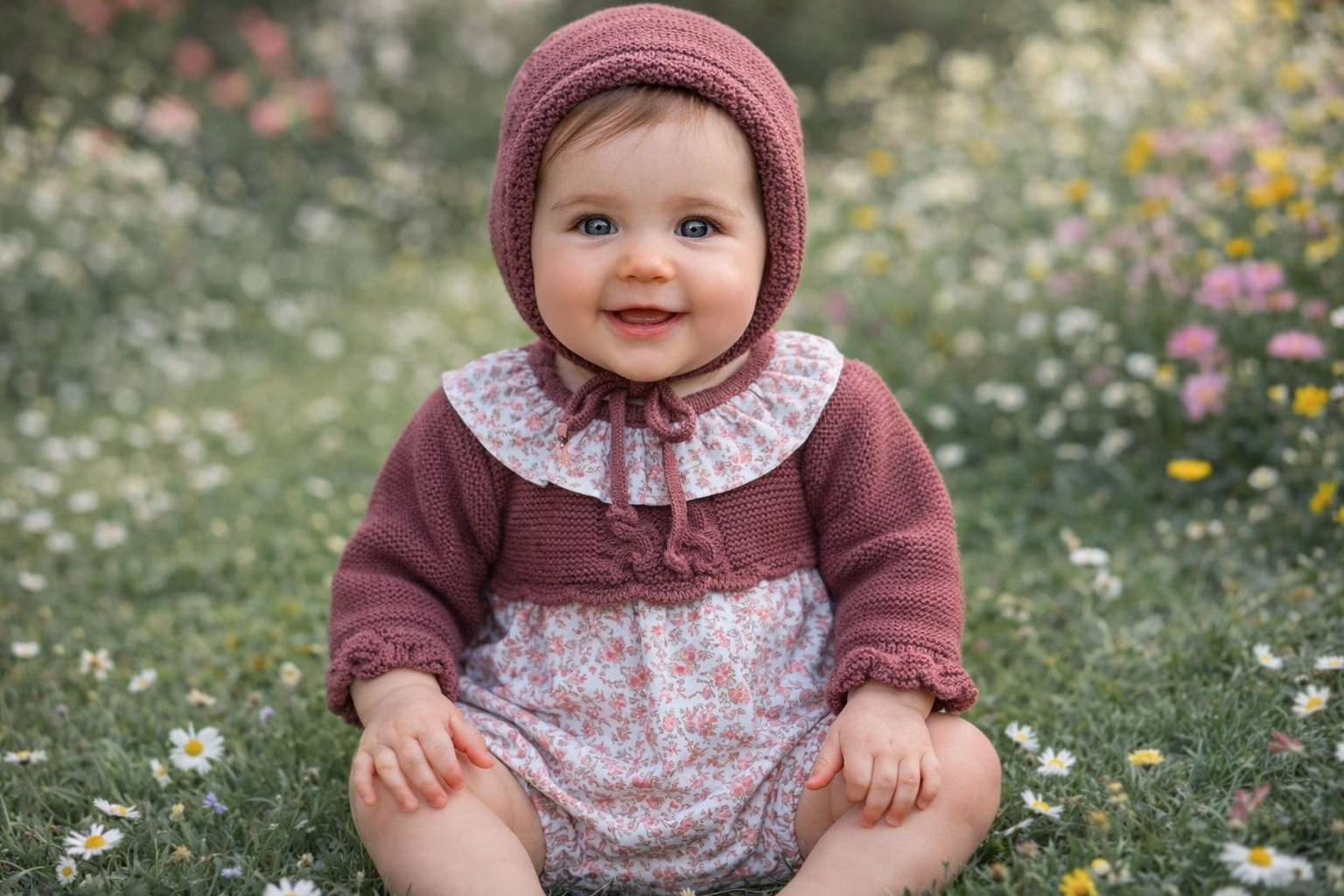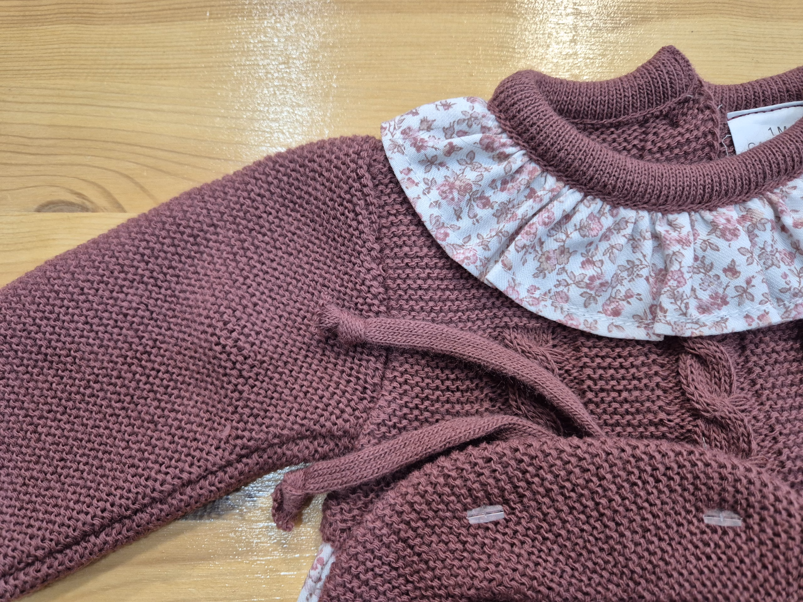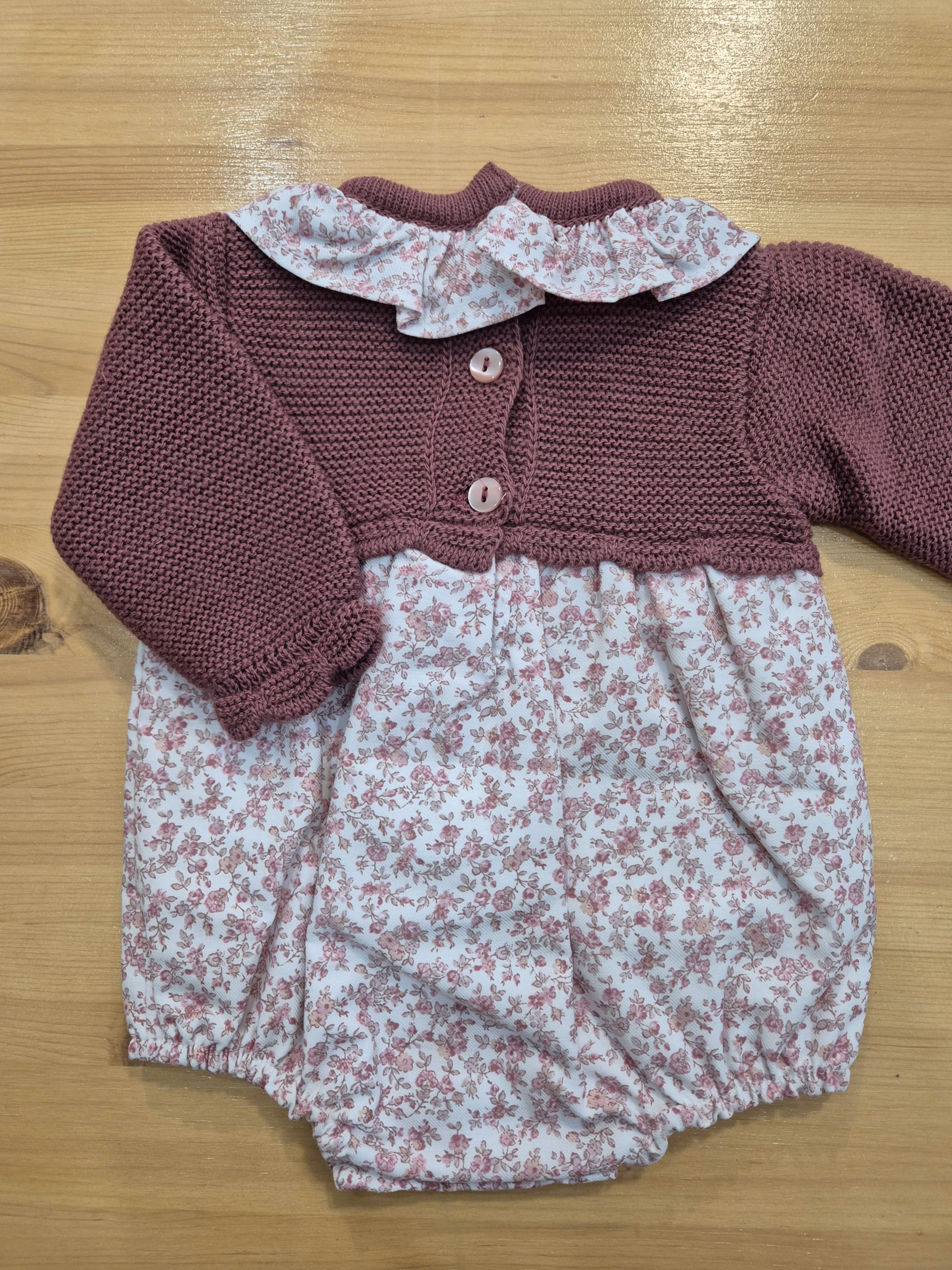 Pelele y capota en dralon + tejido con flores granates. Forro interior y tres botones en la zona del pañal. Alta calidad.