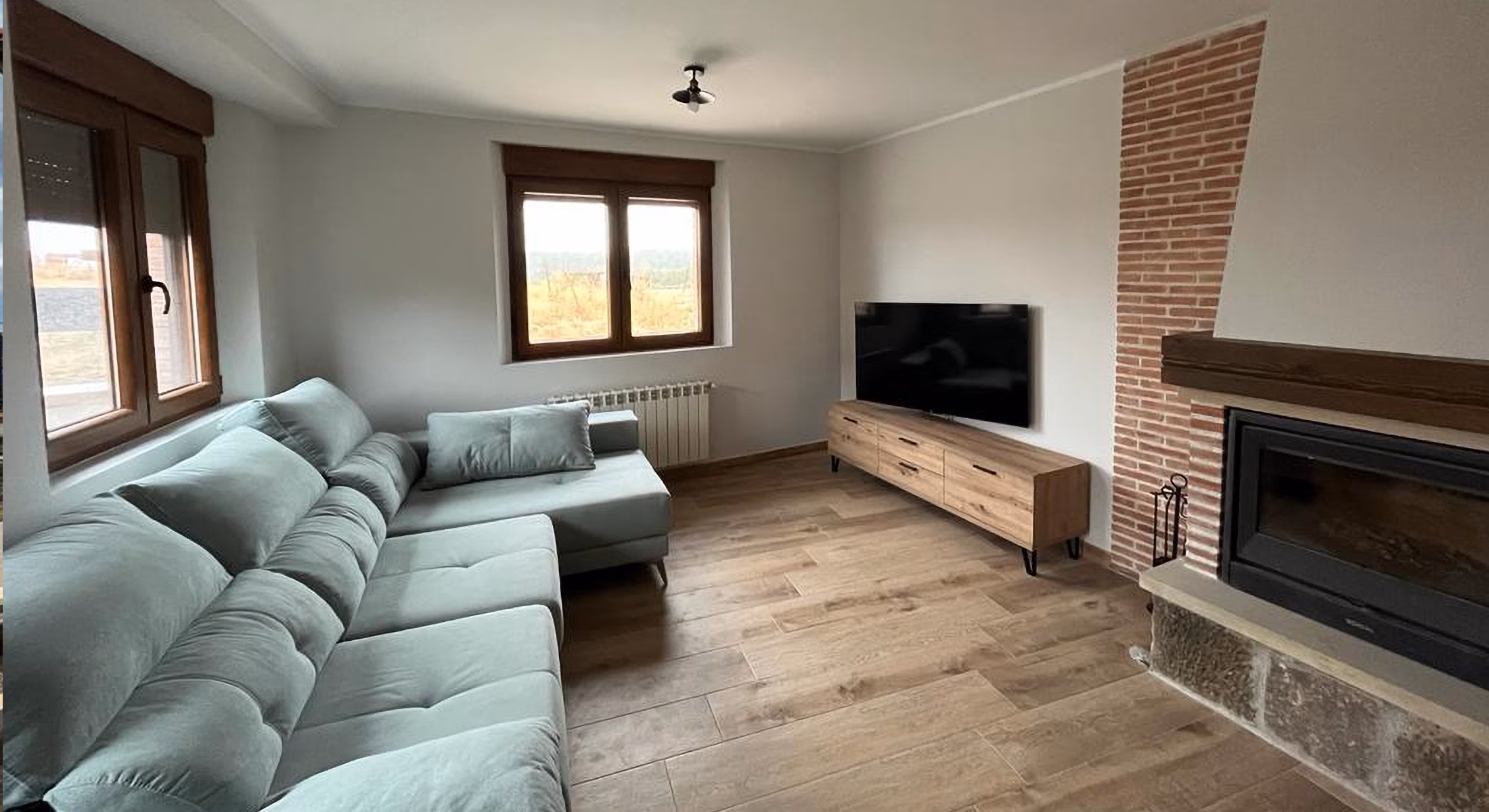 Espacioso salón con chimenea, y una cocina completamente equipada.